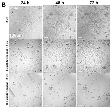 „Unmittelbar danach begann das Monitoring mit einem 24-Kanal-Mikroskop im Inkubator, wobei ein Bild pro Stunde aufgenommen wurde (zenCELL owl, innoME GmbH, Espelkamp, Deutschland). Die Zellen wurden zunächst 24 Stunden zur Adhärenz und Stabilisierung inkubiert, bevor Xevinapant in unterschiedlichen Konzentrationen zugesetzt wurde. Drei Stunden nach der Applikation von Xevinapant wurden die Zellen mit einer Dosis von 2 Gy bestrahlt. Nach 48-stündiger Behandlung mit Xevinapant wurde das Medium durch ein medikamentenfreies Medium ersetzt.“ (S. 3)