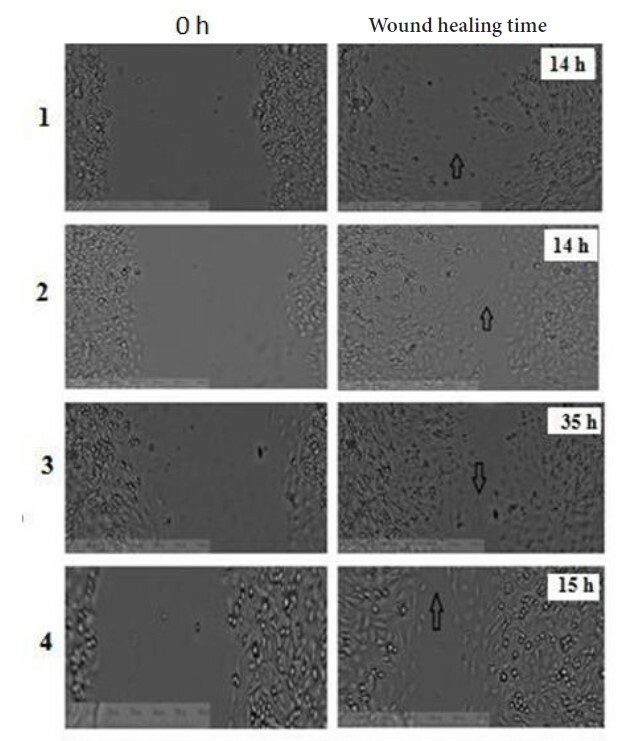 „Die Platten wurden in einen Inkubator bei 37 °C gestellt, und die Zellmigration wurde in Echtzeit mittels Mikrokinematographie überwacht […]. Das Ausmaß der Zellmigration nach 6, 24 und 36 Stunden wurde als Breite der Wundlücke (Scratch) im Verhältnis zur initialen Kratzspur angegeben und in Prozent (%) ausgedrückt.“ (S. 4)