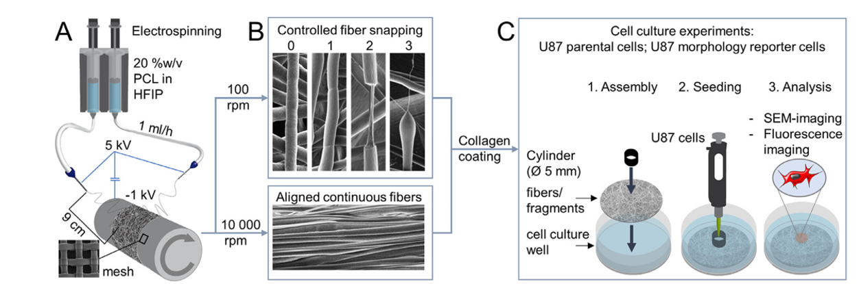 „U87-Zellen wurden auf kollagenbeschichtete bzw. unbeschichtete 24-Well-Platten mit einer Dichte von 30.000 Zellen ausgesät. Das Medium wurde mit frei schwebenden Fasern in einer Konzentration von 1 mg/ml angereichert bzw. ohne diese supplementiert. Nach 2 Stunden wurden die 24-Well-Platten in ein zenCELL owl Live-Cell-Imaging-Mikroskop gestellt […] und über 3 Tage beobachtet. Die Wells wurden alle 17 Minuten aufgenommen, und die Zellbedeckung, die Anzahl adhärenter Zellen, die Anzahl nicht-adhärenter Zellen sowie die Gesamtzellzahl pro einzelnem Kultur-Well wurden erfasst. Diagramme und Videos der Live-Cell-Bildgebung wurden mit dem zenCELL owl […] erstellt.“ (S. 4)