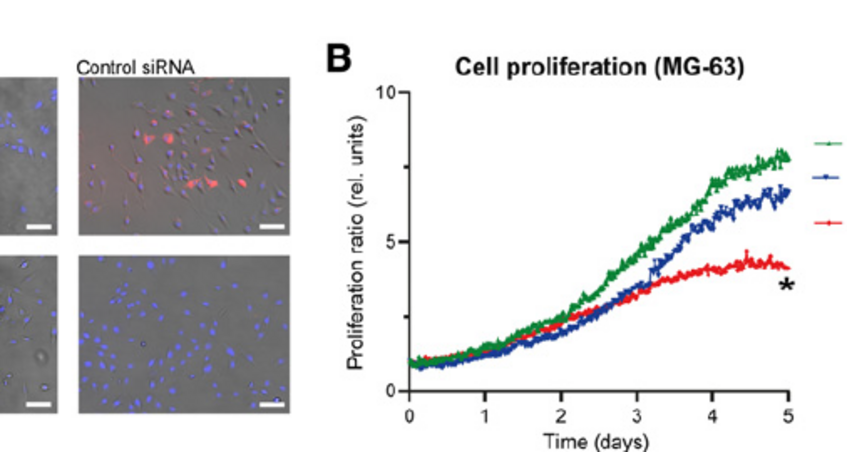 „Mit siRNA transfizierte AsPC-1-Zellen wurden bei niedriger Zelldichte (2 × 10⁴) in 24-Well-Platten in dreifacher Ausführung (für Kontroll-siRNA in zweifacher Ausführung) ausgesät. Anschließend wurde das Zellwachstum in Echtzeit über einen Zeitraum von 8 Tagen mit einem zenCELL Owl Live-Cell-Imaging-Mikroskop (innoME GmbH, Deutschland) überwacht. Die Bilder wurden im 20-Minuten-Intervall aufgenommen, und die Gerätesoftware berechnete zu jedem Messzeitpunkt den prozentualen Konfluenzgrad der adhärenten Zellen [51].“ (S. 484)