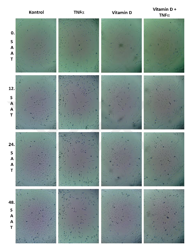 „MG-63-Zellen, die in 24-Well-Platten ausgesät wurden (3×10⁴ Zellen/Well/450 µL), wurden mit den in Tabelle 1 gezeigten Behandlungen behandelt, um die morphologischen Veränderungen und Veränderungen der Zelladhäsion auf der Oberfläche durch Vitamin D, Atorvastatin und TNF-alpha auf Osteosarkomzellen zu untersuchen.